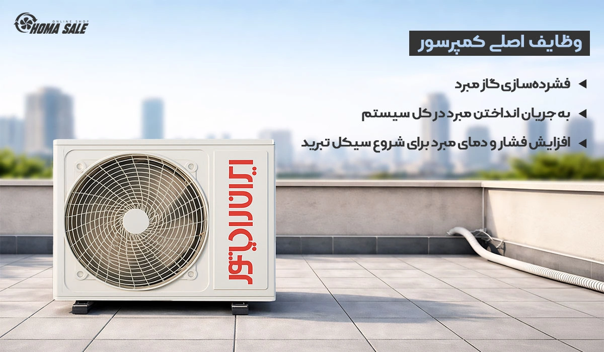 کمپرسور قلب تپنده کولر گازی است و وظیفه فشردهسازی گاز مبرد را بر عهده دارد. این فشردهسازی باعث افزایش دما و فشار مبرد میشود تا بتواند گرما را به بیرون منتقل کند و چرخه سرمایش آغاز شود.