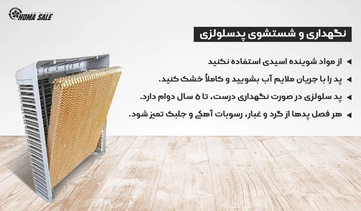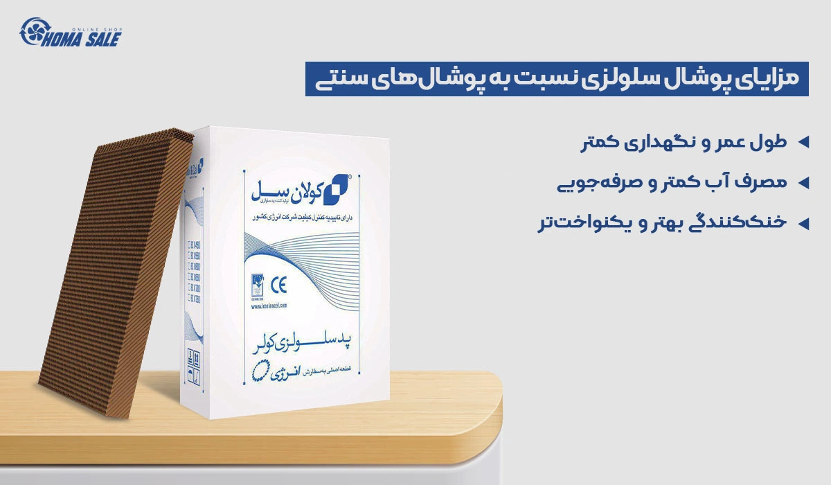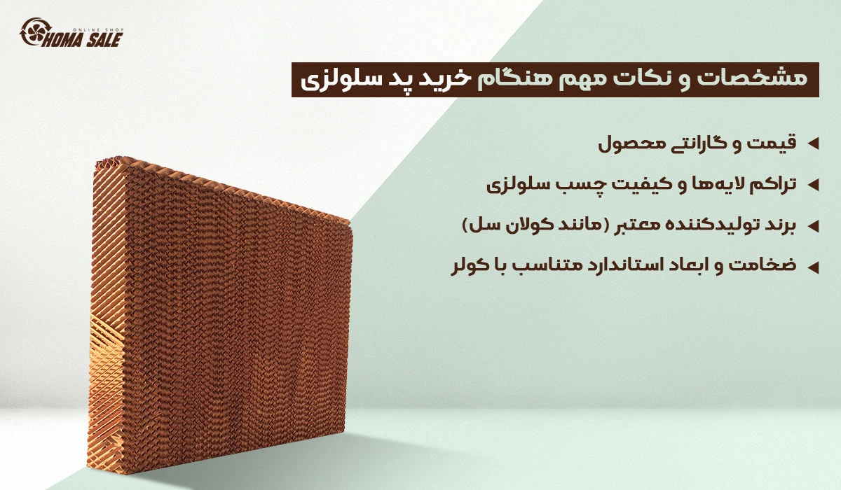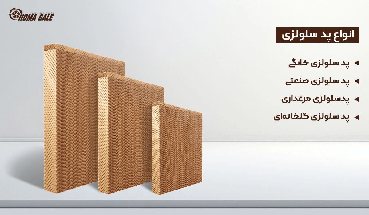 | پد سلولزی خانگی | ۵ تا ۱۰ سانتیمتر | سلولز مقاوم به پوسیدگی | کولرهای آبی خانگی | جایگزین پوشال، سرمای یکنواخت، مصرف آب کمتر | ۳ تا ۵ سال |