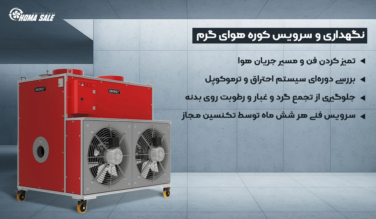 برای حفظ عملکرد بهینه و افزایش طول عمر کوره هوای گرم انرژی، نگهداری منظم و سرویس دوره‌ای ضروری است. تمیز کردن فن و مسیر جریان هوا، بررسی سیستم احتراق و ترموکوپل و  جلوگیری از تجمع گرد و غبار روی بدنه، از اقدامات کلیدی محسوب می‌شوند. همچنین سرویس فنی هر شش ماه توسط تکنسین مجاز تضمین می‌کند که دستگاه همیشه در شرایط ایمن و کارآمد فعالیت کند و هزینه‌های تعمیر و نگهداری کاهش یابد.